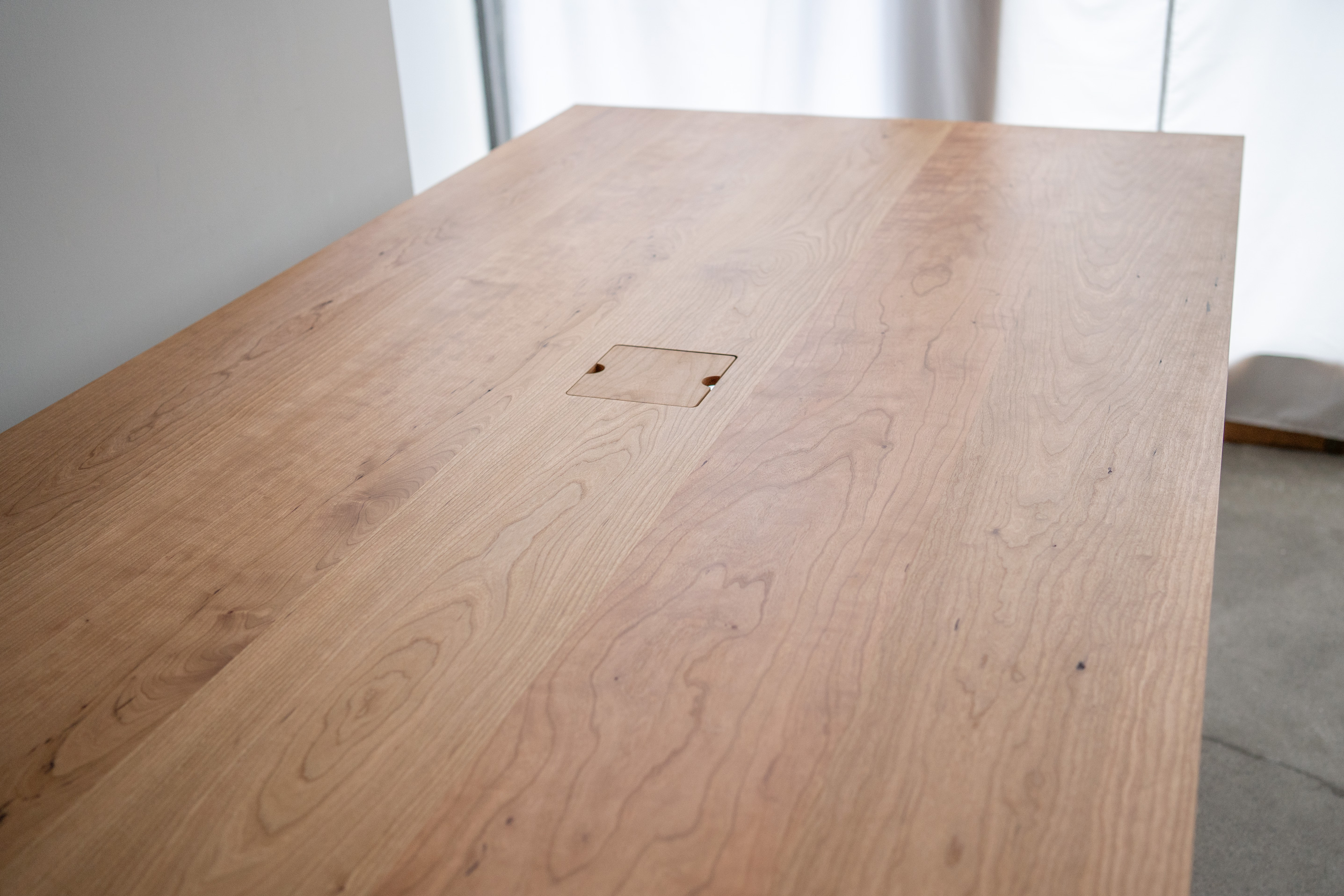 天板の中央にある開口部の下には、コンセントタップが6口セットしてあります。皆さまがノートパソコンやスマートフォンを充電しながらミーティングをしていただけるように、お客様のご要望に合わせて特注製作させていただきました。お使いにならないときは天板と同じチェリー材の蓋を閉めて頂けるようにしました。
