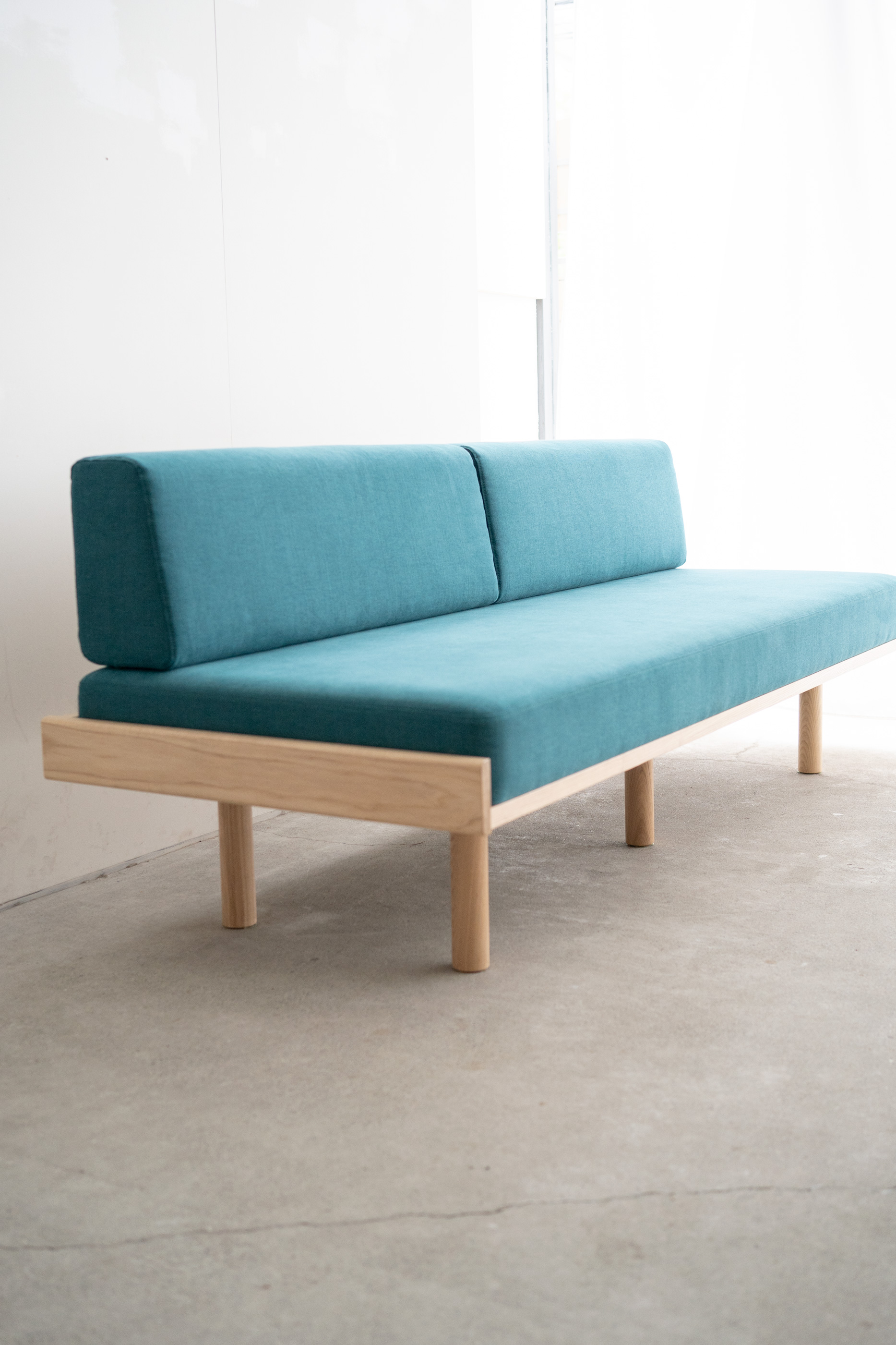 SOFA LAY の幅1840mmタイプを製作させていただきました。明るい褐色のタモ材にビリジアンカラーの生地の組み合わせ。WOODWORK店頭でも展示させていただいている組み合わせです。