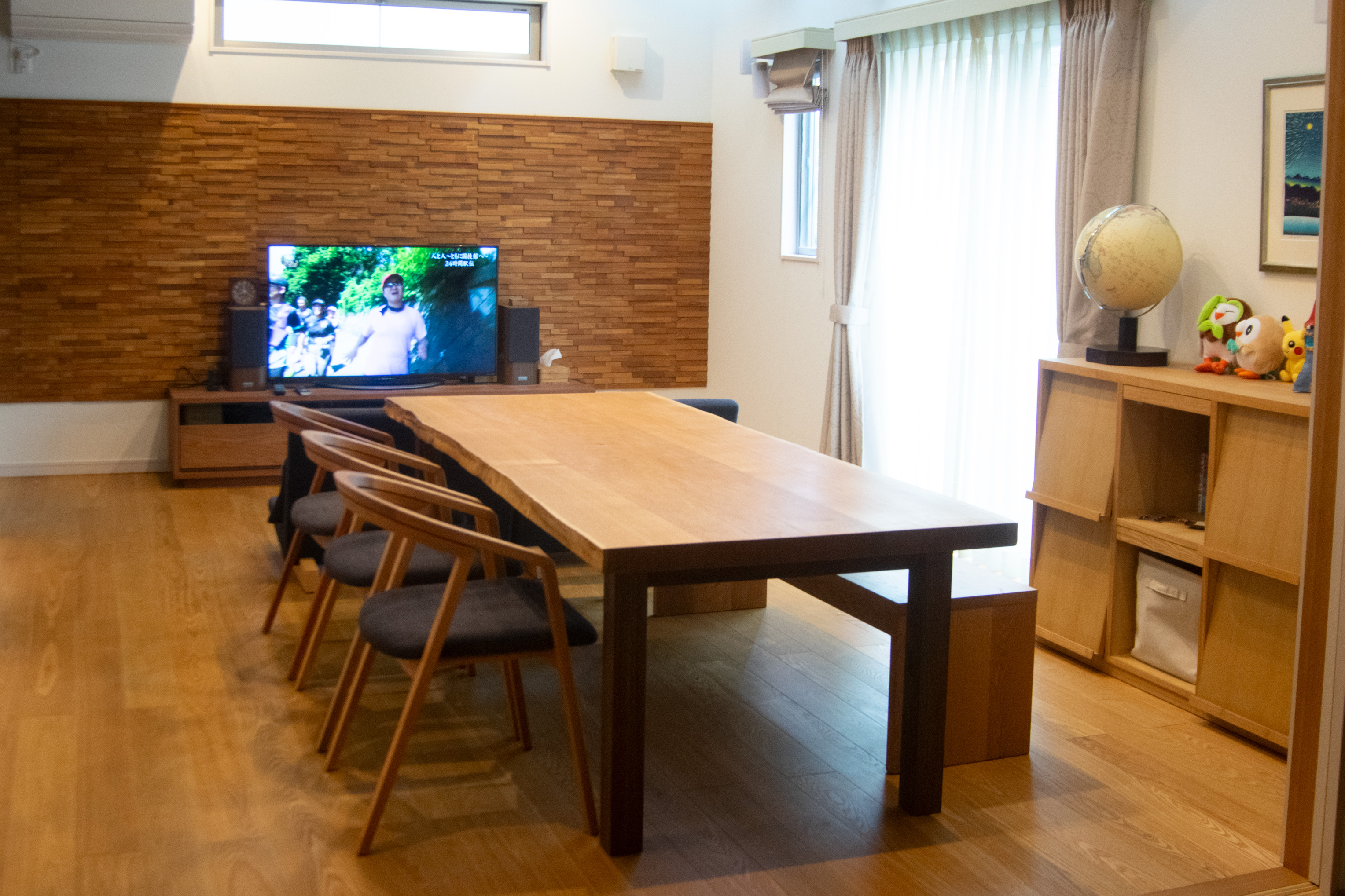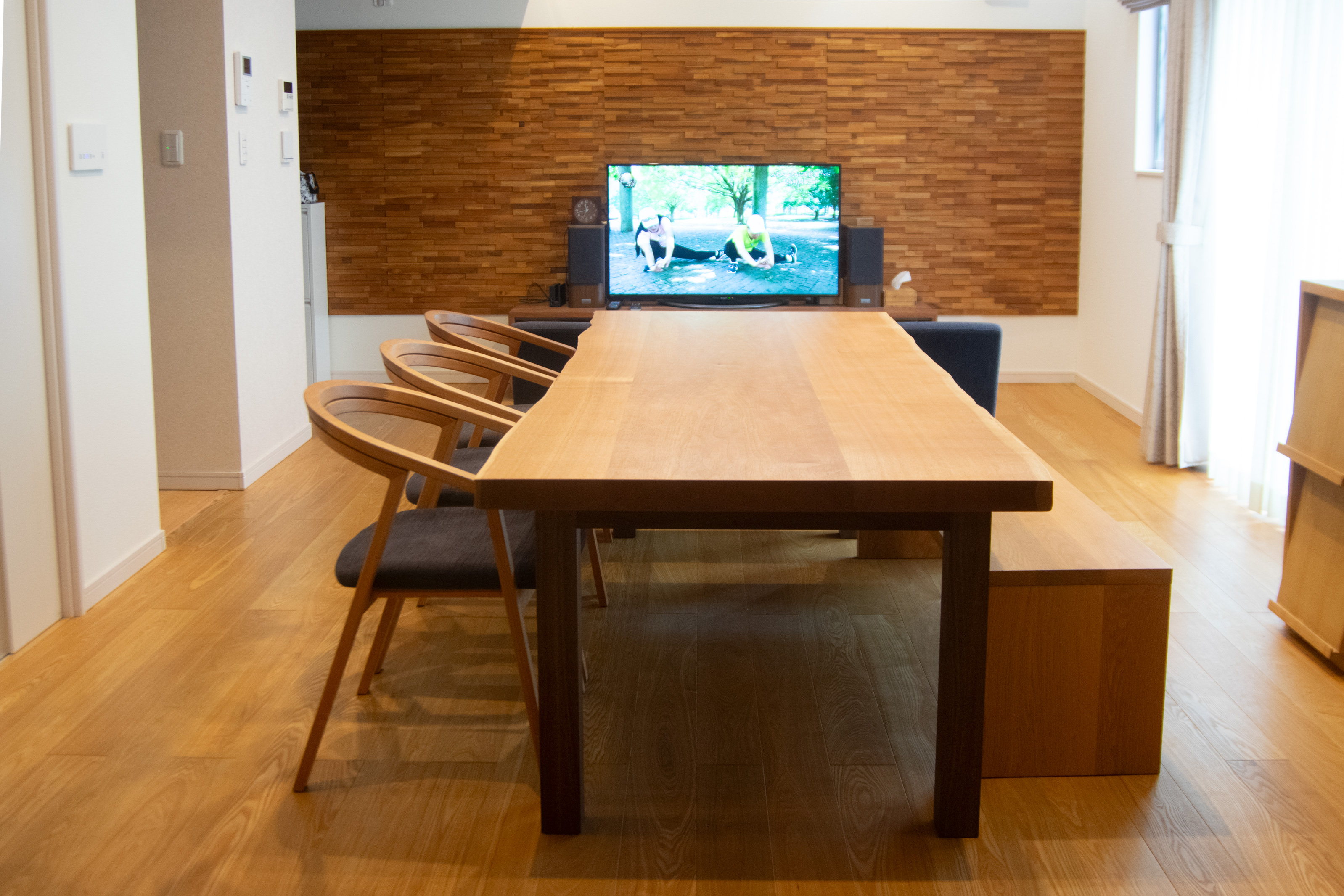 アームチェアをゆったり3台並べてお使いいただける、2メートルを超えるサイズのテーブルが広いダイニングに収まりました。ご家族皆さまで過ごす団らんテーブルとしてお楽しみいただければ幸いです。
