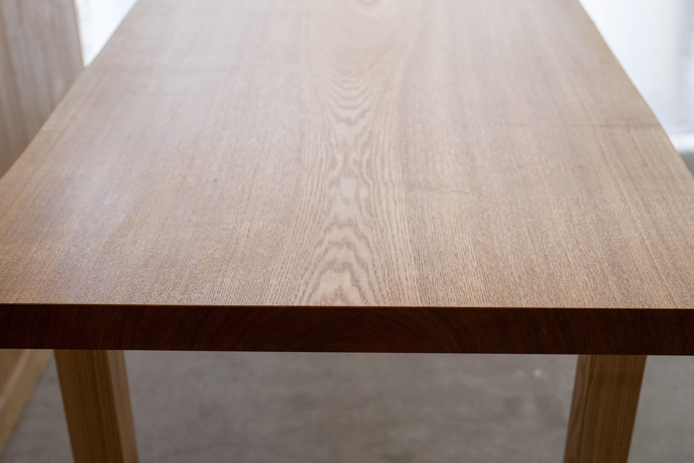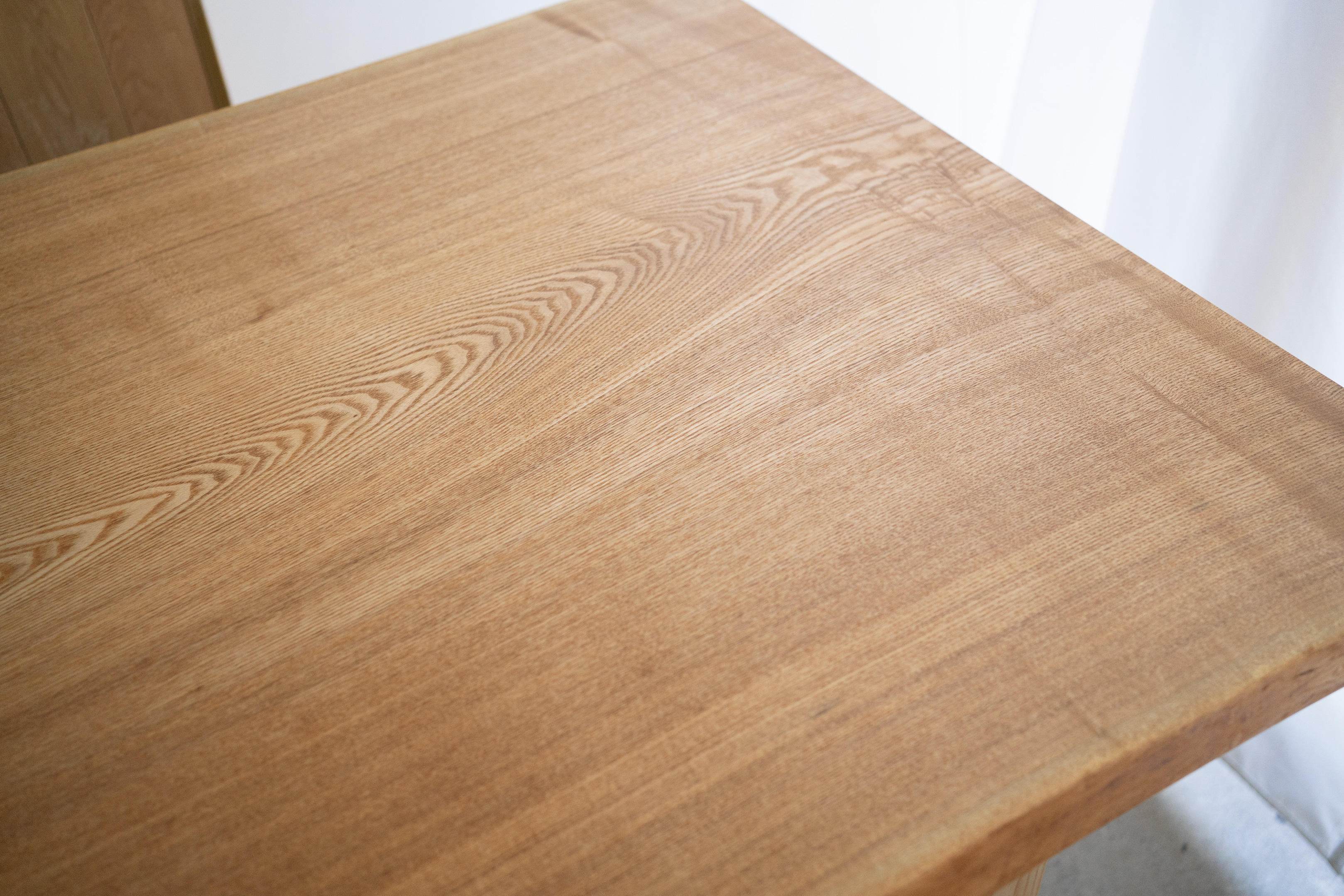 タモ材は導管(木の中の水が通るための穴が木目として表面に現れている)がハッキリとしていて、天板を撫でて頂くと少しざらっとした肌触りとして感じることが出来ます。時間とともに褐色の色合いが少し濃く変化してゆく様子もタモのテーブルをお使いいただく楽しさの一つです。どうぞ末永くご愛用頂ければ幸いです。このたびはりがとうございました。