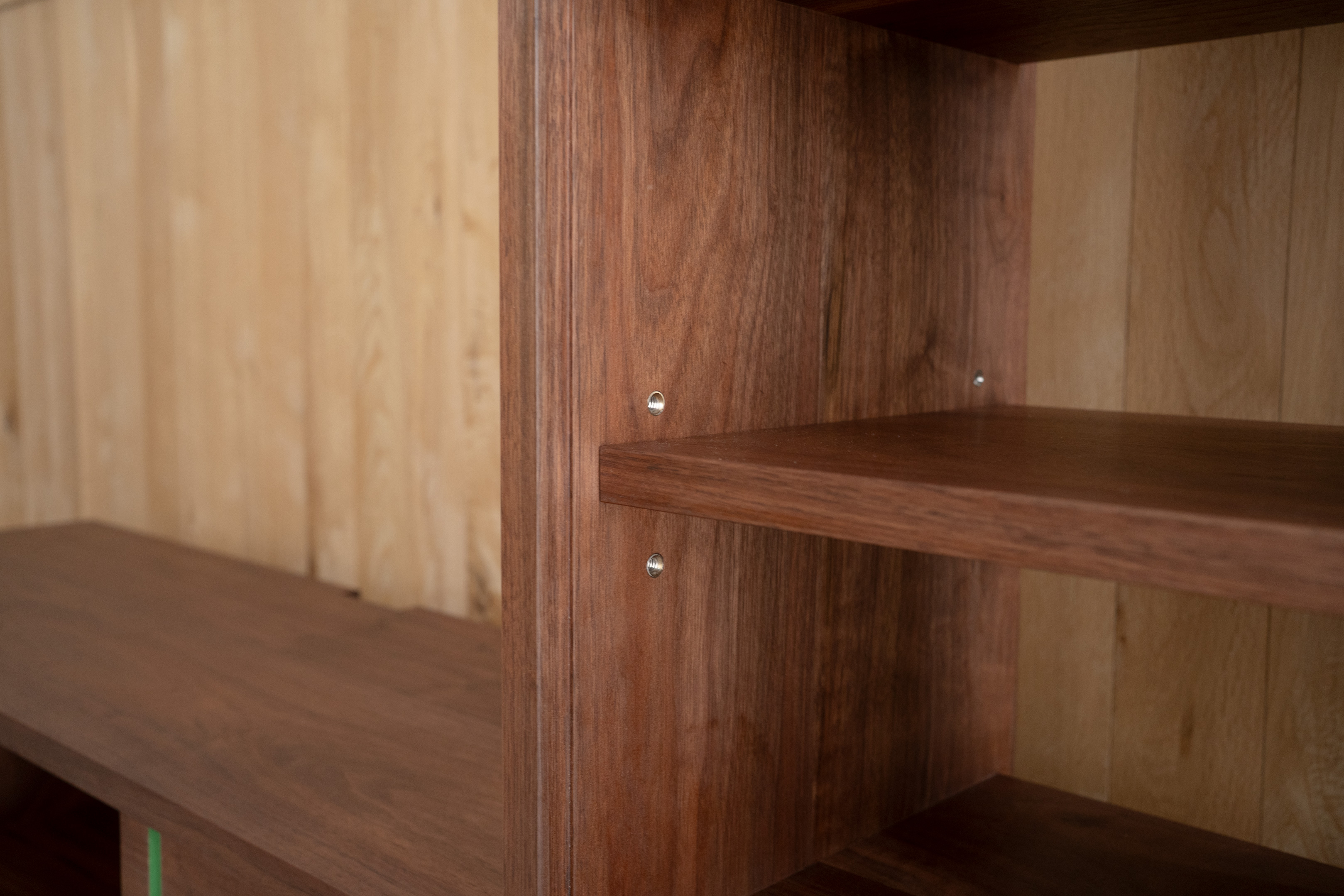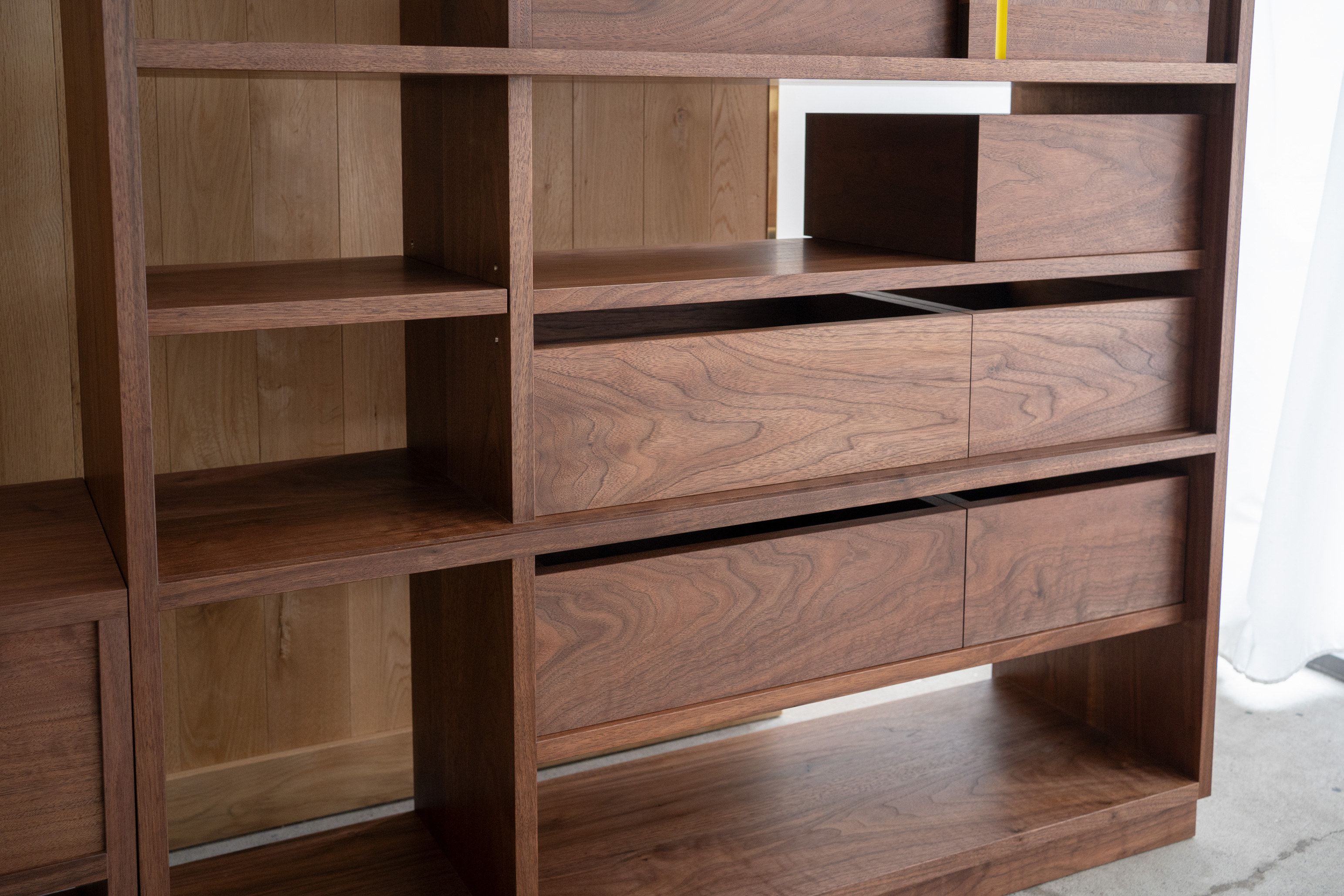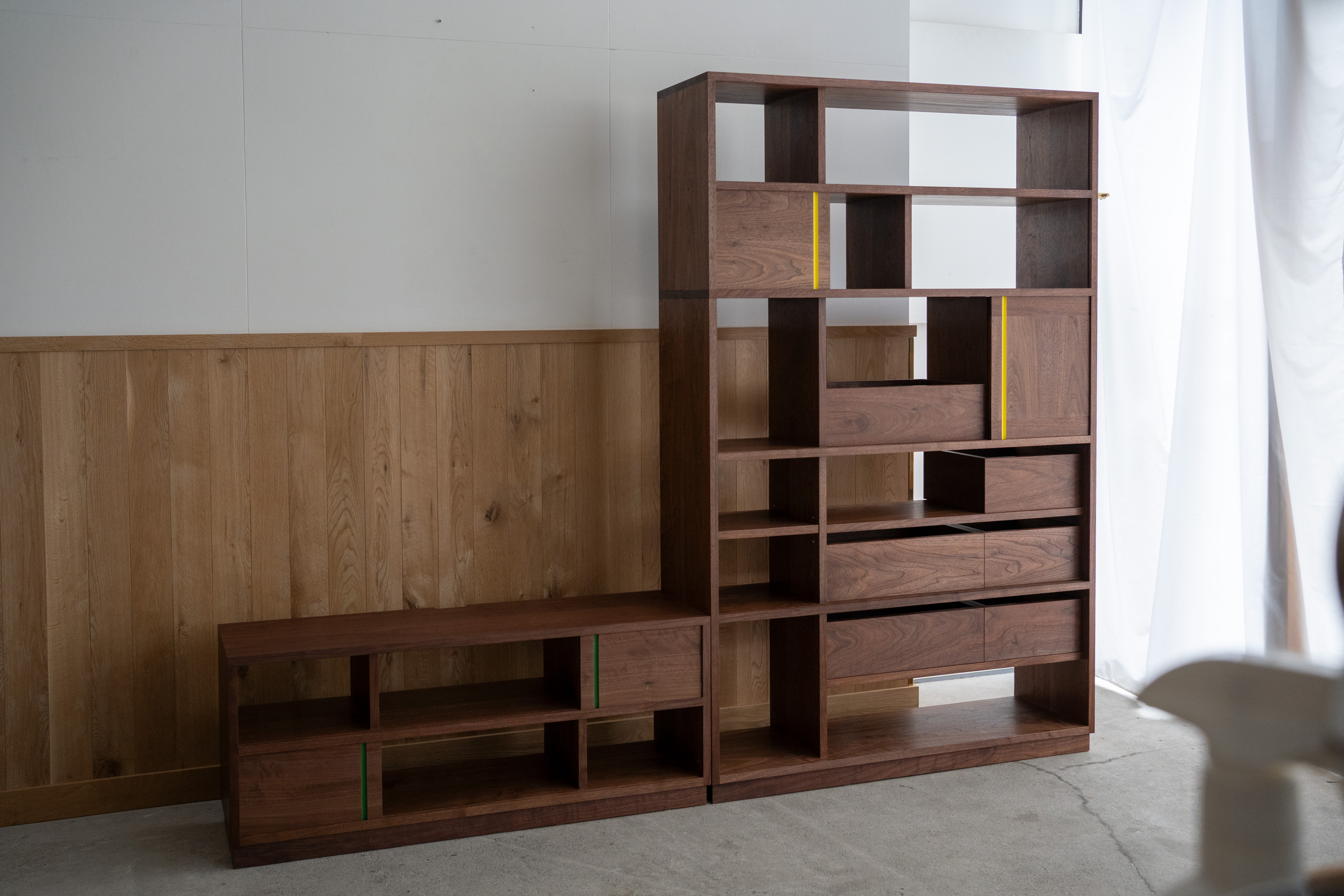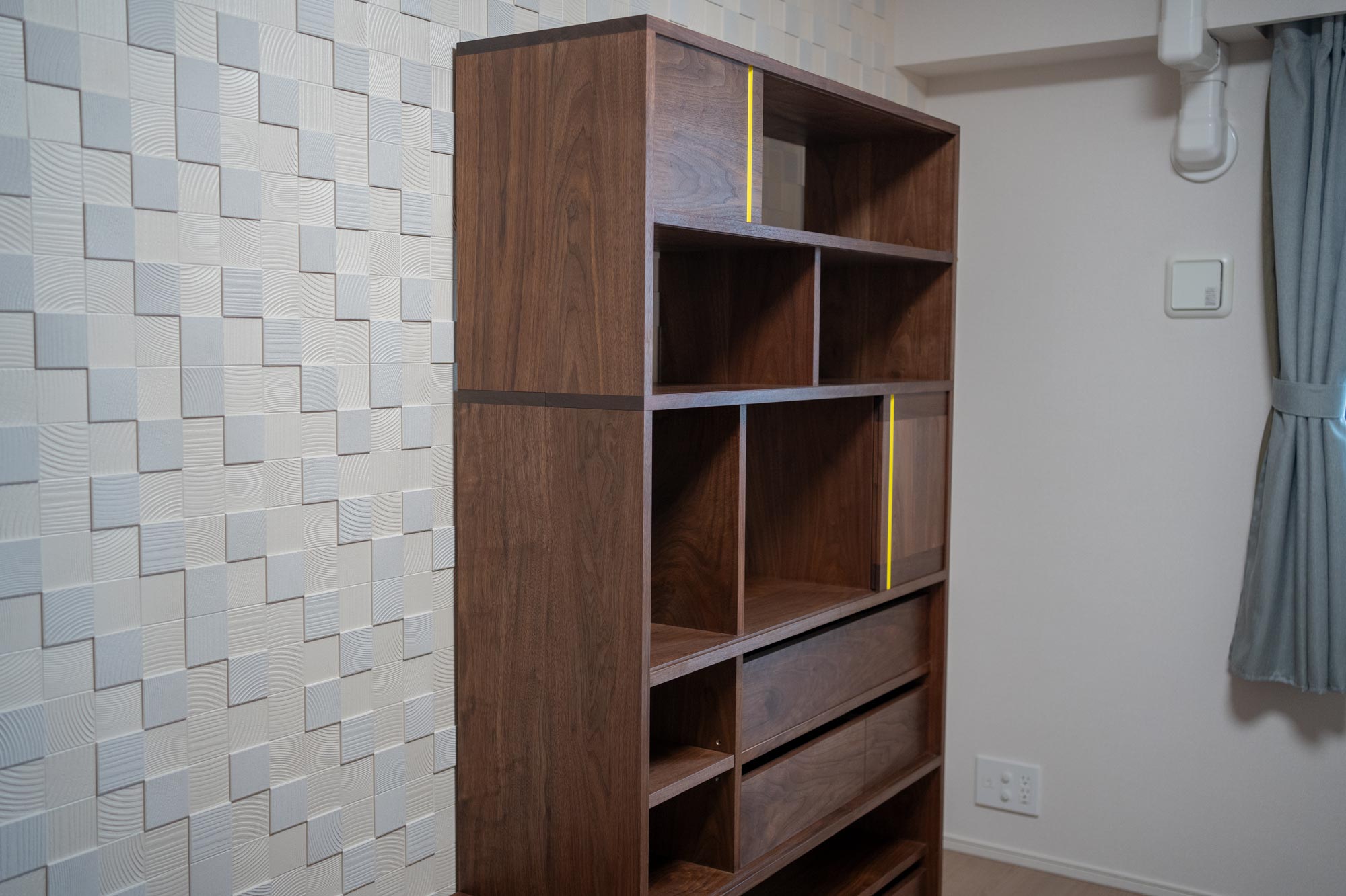 この2つをより楽しんで頂くために、棚板の高さと幅を部分的に同じ寸法で設定し、各段に片引き扉用の溝を掘っています。