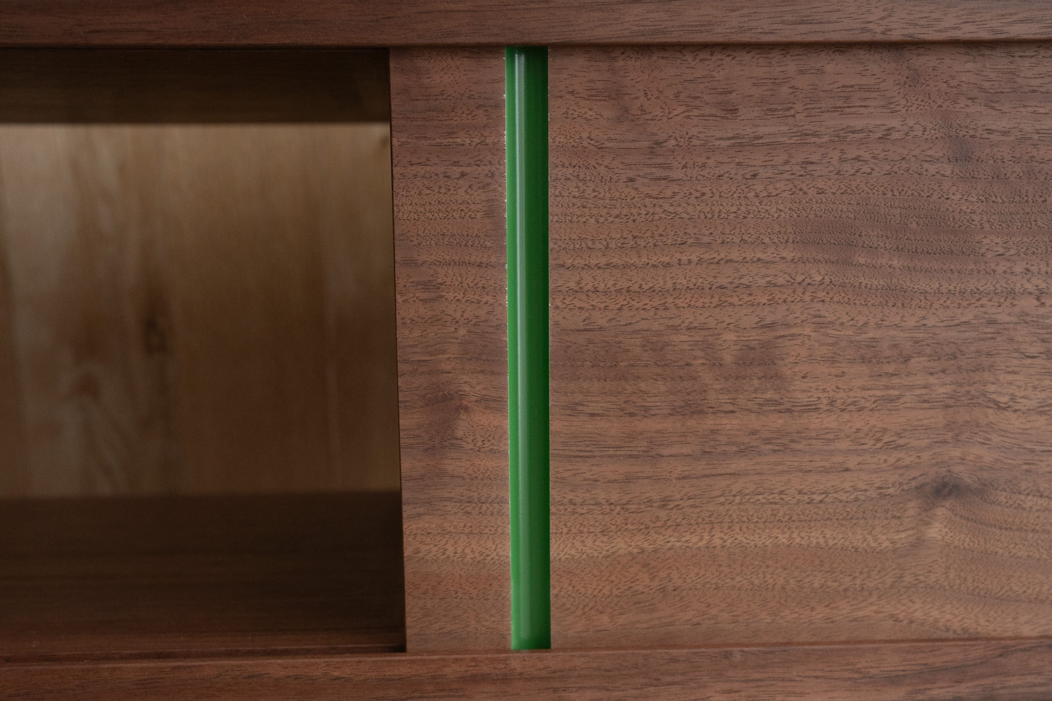 丸溝はウレタンで塗装されているので、濃い木肌のウォールナットにも負けない発色と存在感が家具全体の差し色になり、ウォールナットの重厚感を保ちつつも程よくカジュアル感のある楽し気な雰囲気に仕上がっています。