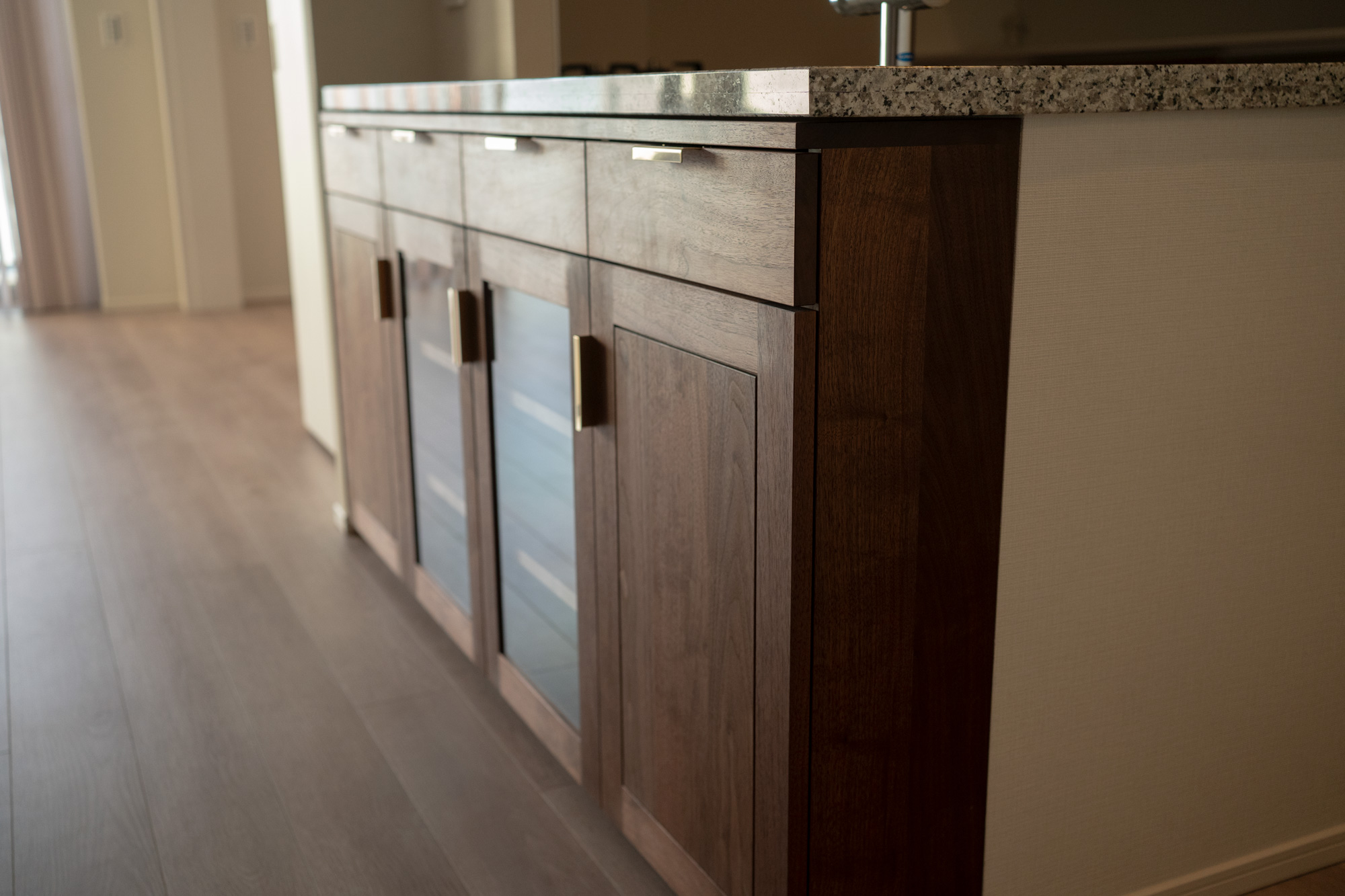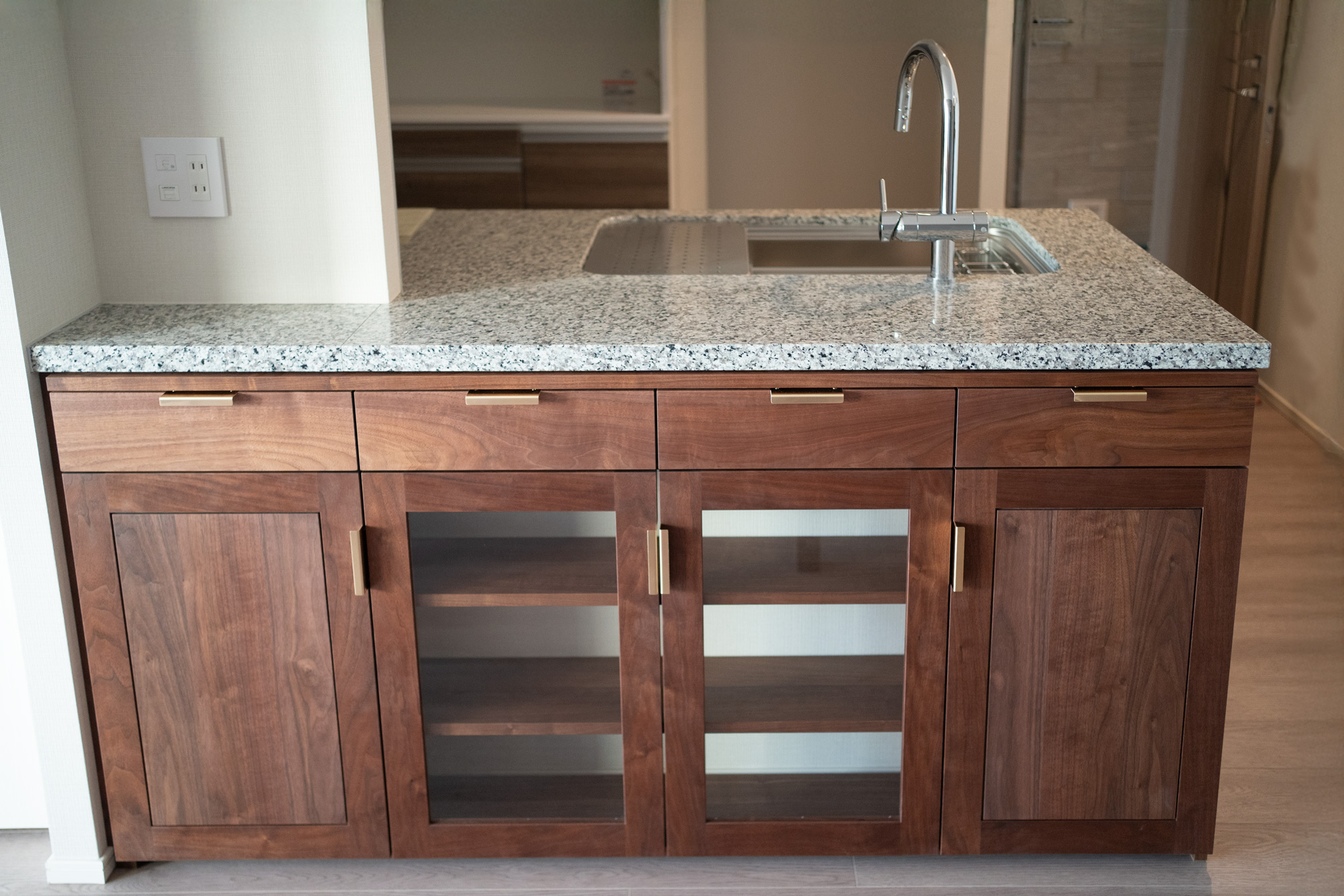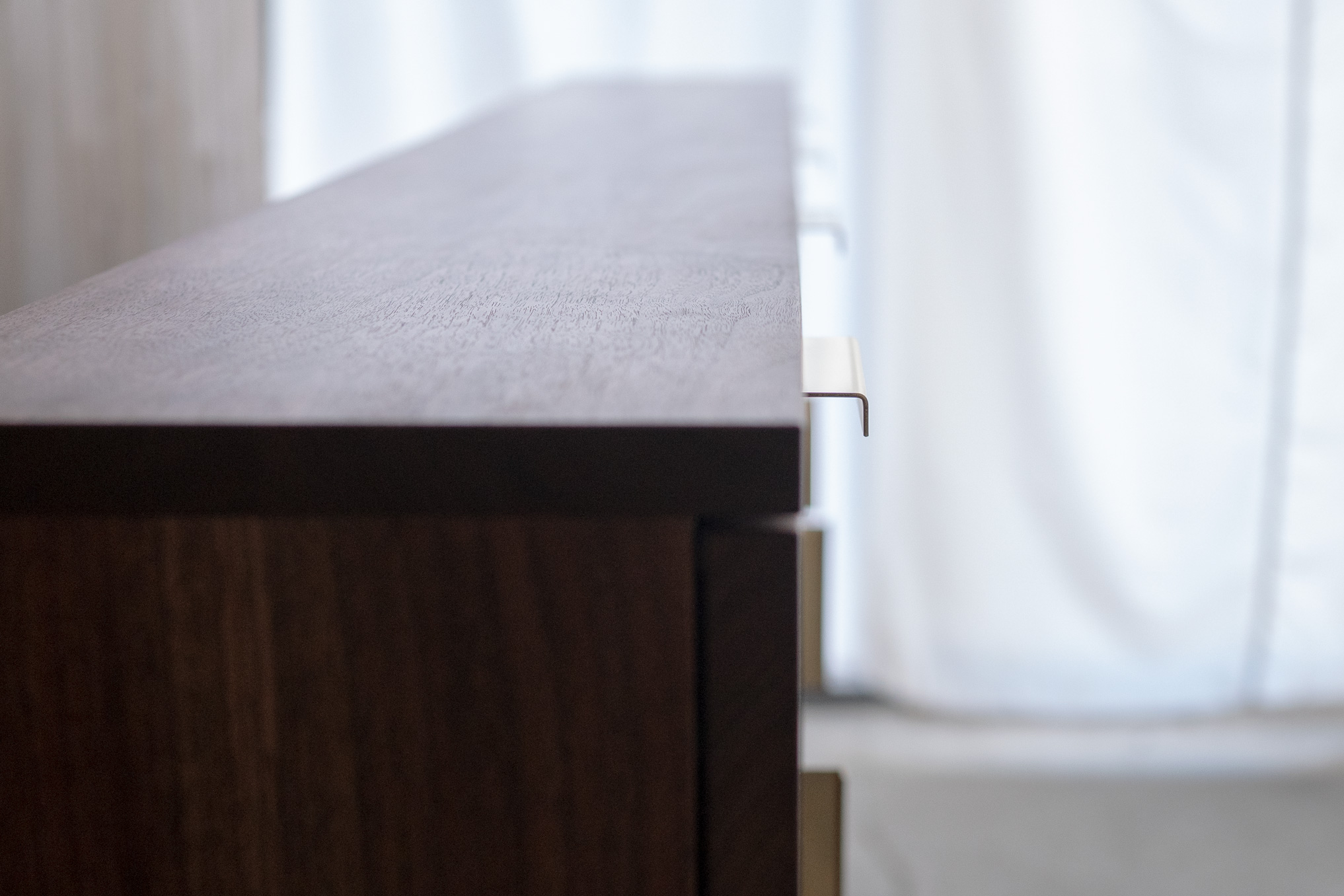 真鍮製の取っ手をつけたウォールナット材、カウンター下収納を製作させていただきました。