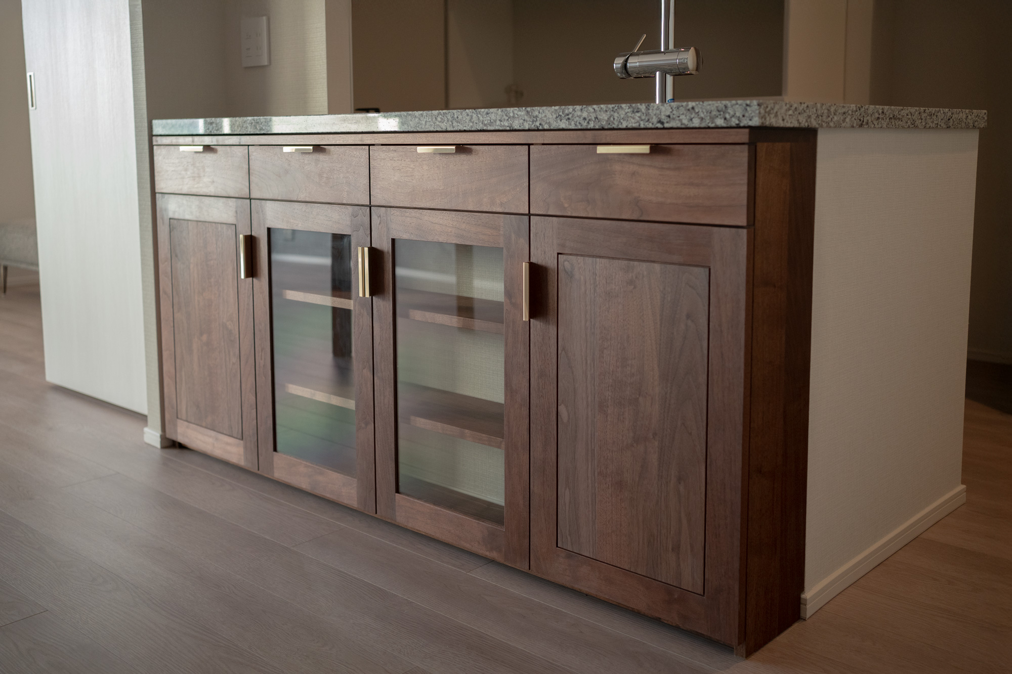 現調にお伺いしてカウンター下ぴったりのサイズで製作させていただきました。中央のガラス扉の中にはグラスやカップ類を収納していただき、左右の木の扉の中には背の高いボトル類を収納していただけるように設計しています。ガラス扉は抜け感があるので、より圧迫感のない収納家具になりました。