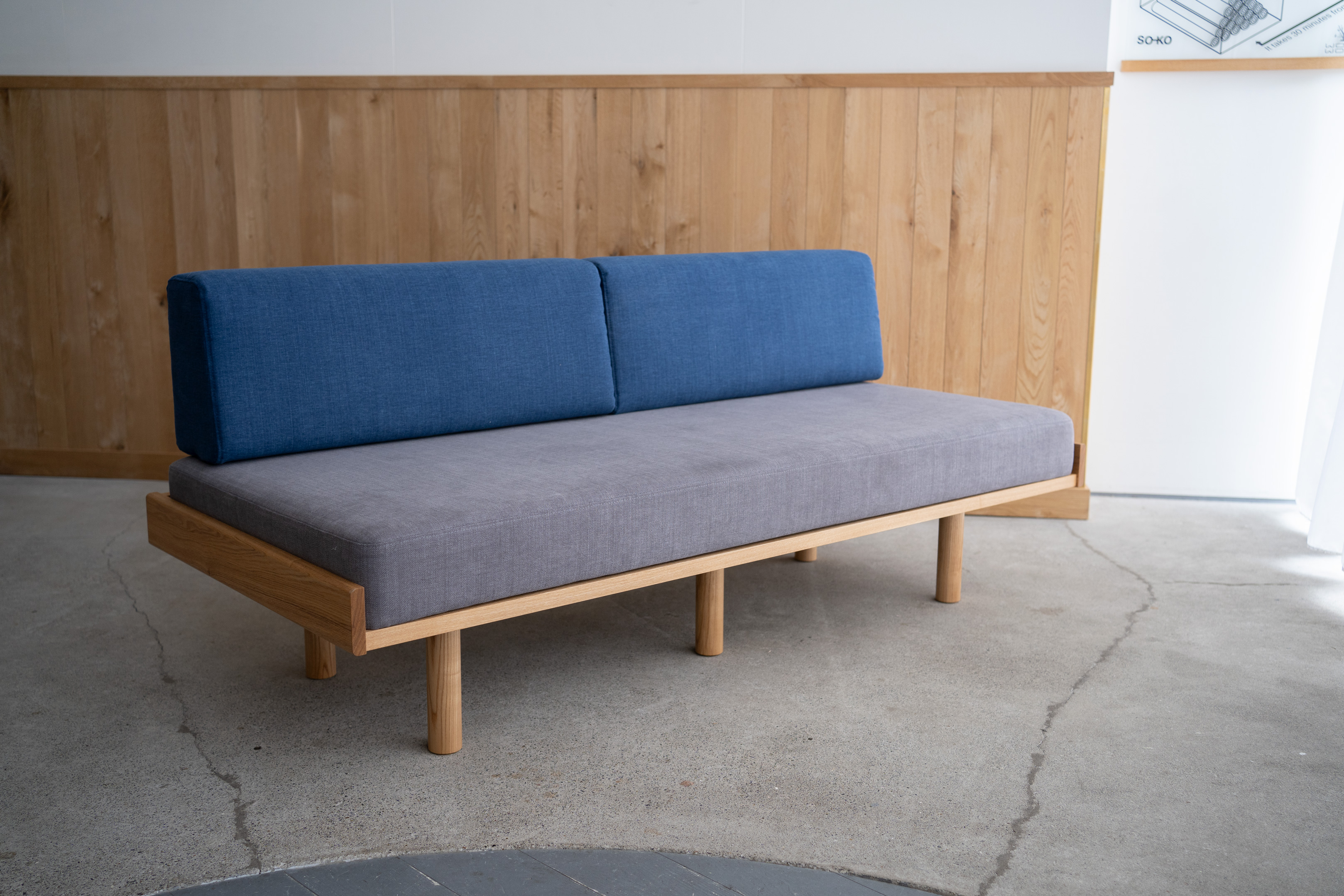 ブルーと淡いグレーを合わせたバイカラーのソファ「LAY」を製作しました。