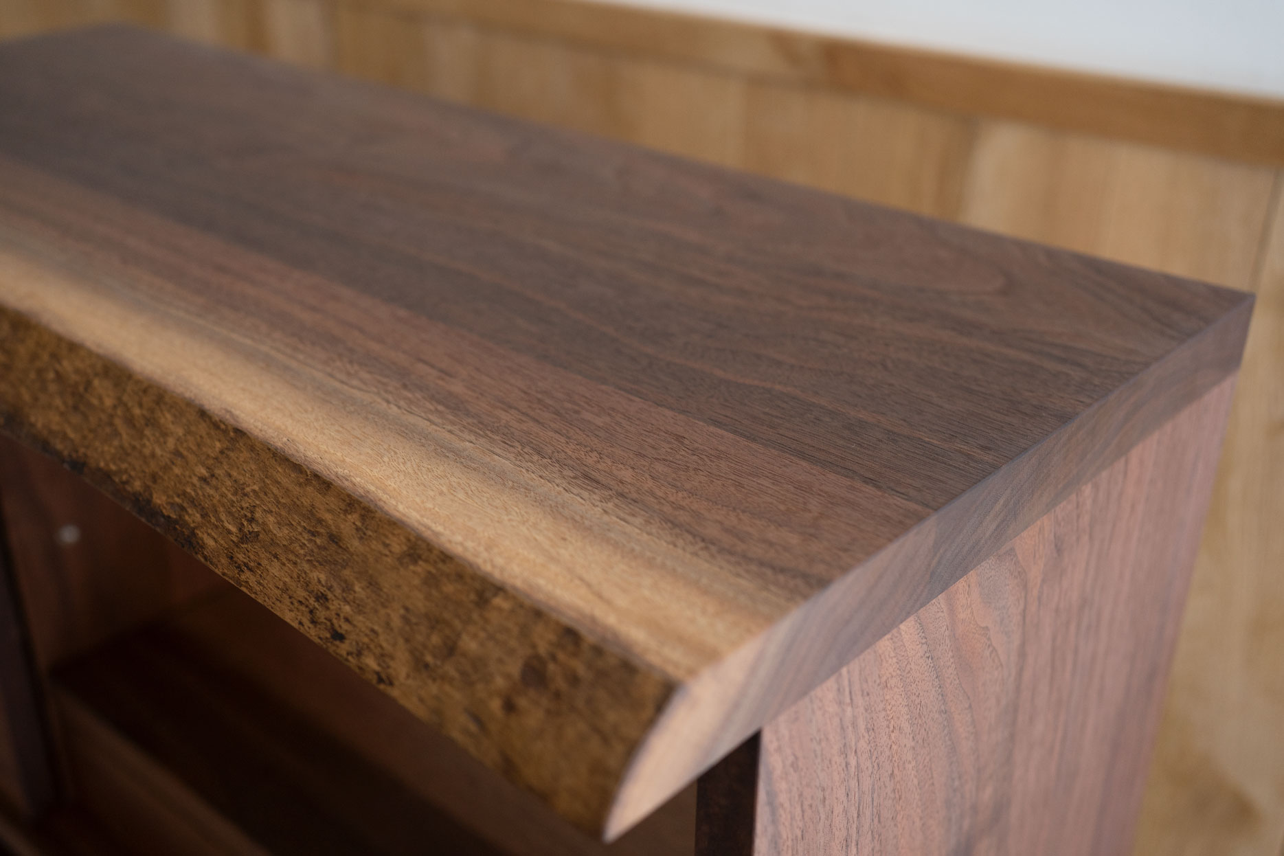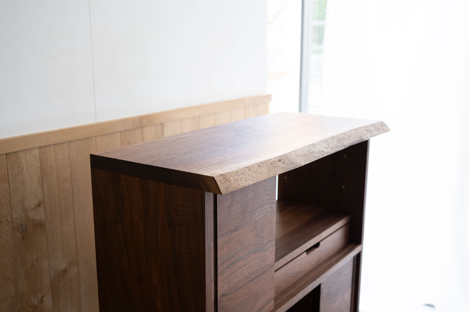 ウォールナット材は丸太の中心側が濃暗褐色、外側のシラタの部分が明るく白っぽい褐色と、赤身とシラタとのコントラストがハッキリしているのが特徴です。このたびはシラタの外側の薄皮がほんのり残るくらい、出来るだけ削り取らずに自然の色合いを残した仕上にしています。
