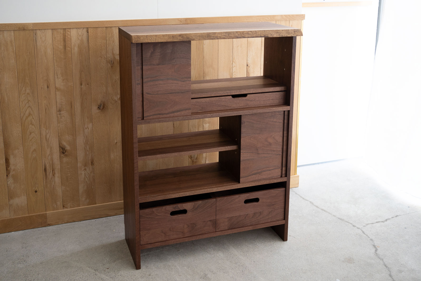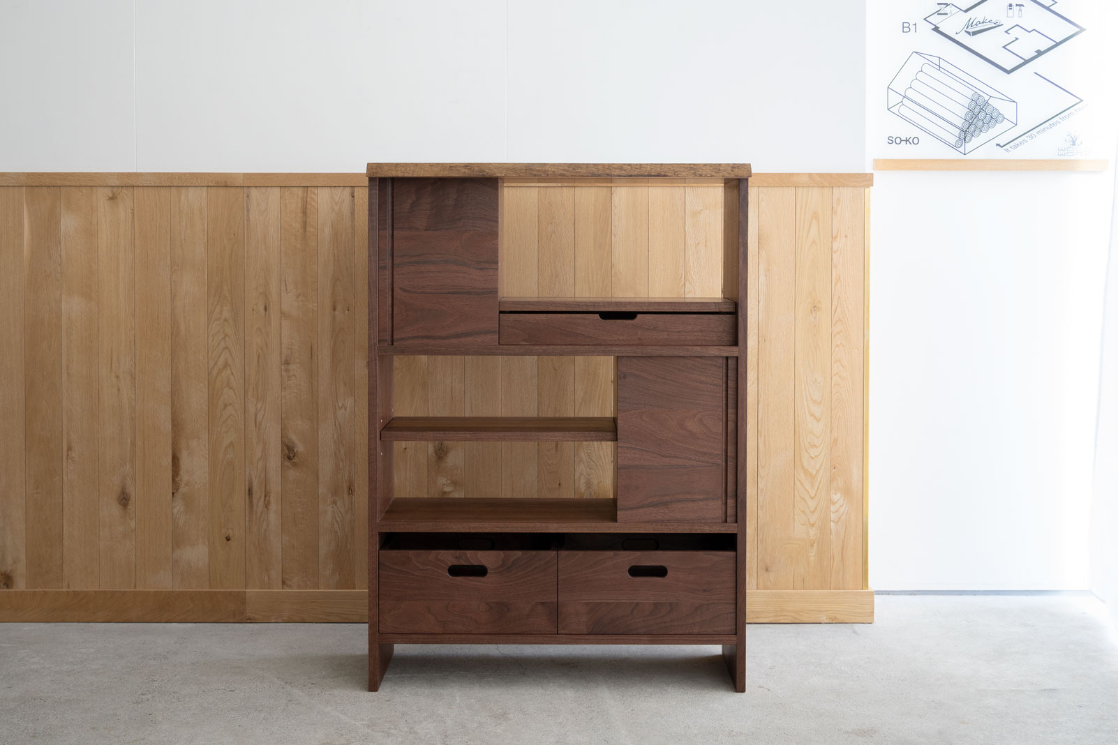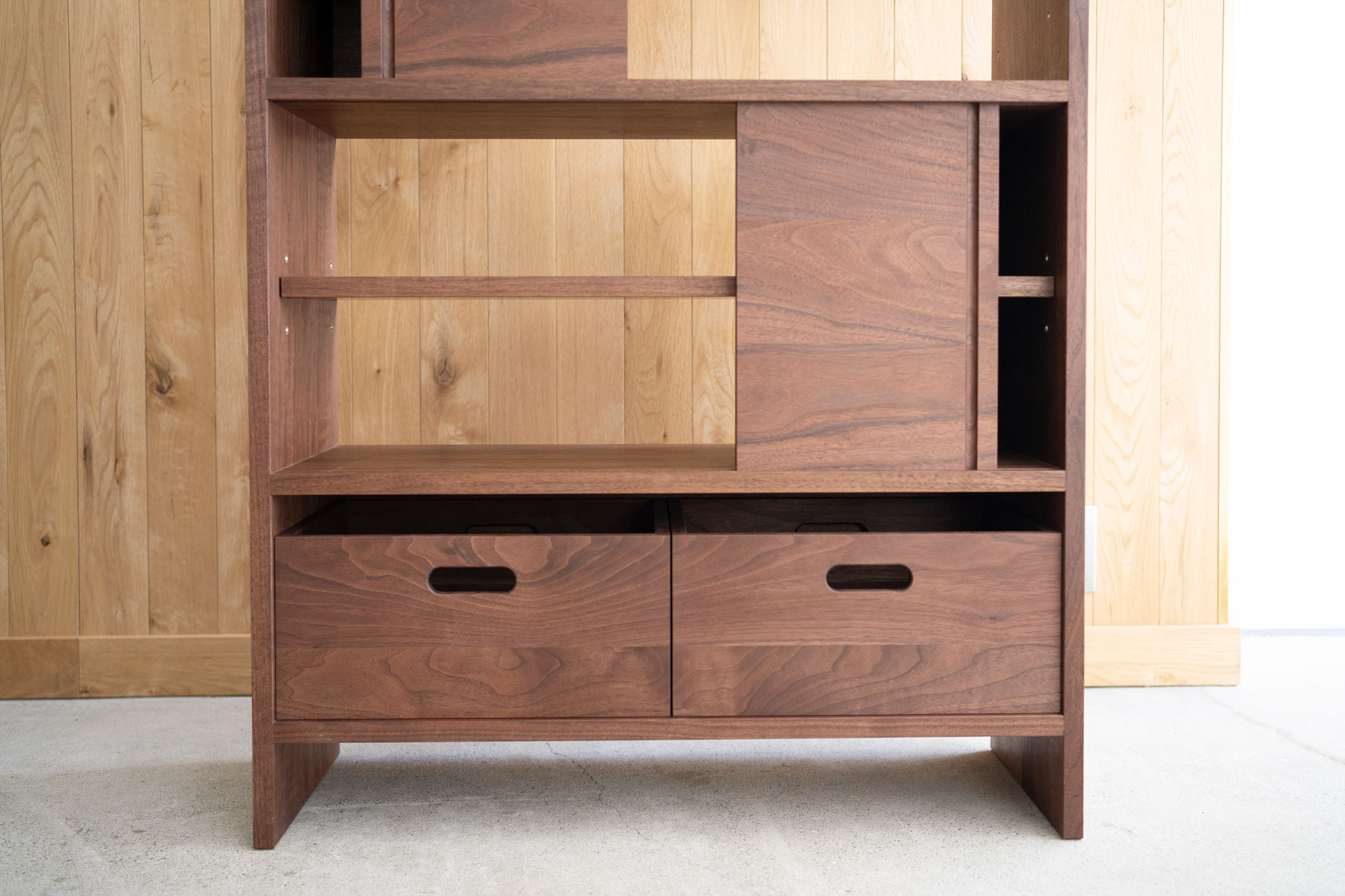 上段の薄い引き出しは、棚板の位置を変えることで使う位置を入れ替えることができるように設計しました。下の画像は引き出しの位置を一番上に移動した様子です。