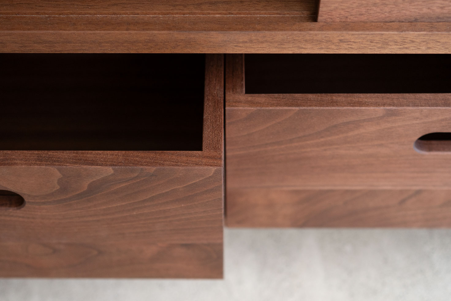 下段の引き出しも取り出して使えるボックス状の引き出しです。少し重いものが入っていても取り出して持ち上げやすいように、手の入る隙間と大きめの取っ手を付けさせていただきました。表側、裏側がそれぞれに木目がつながるように製作しています。