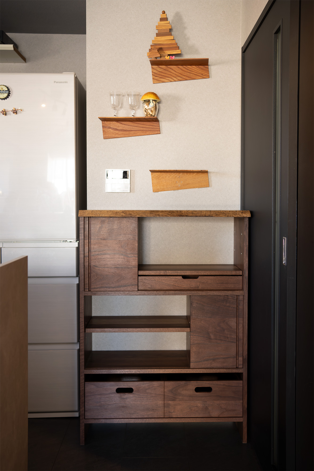 お料理がお好きなお客さま御夫妻。集めた食器やグラスなど、お気に入りのアイテムをしまっていただけるそうです。以前にご購入くださった3つのA4シェルフも合わせてレイアウトしてくださいました。季節感を演出する素敵なスペースですね!