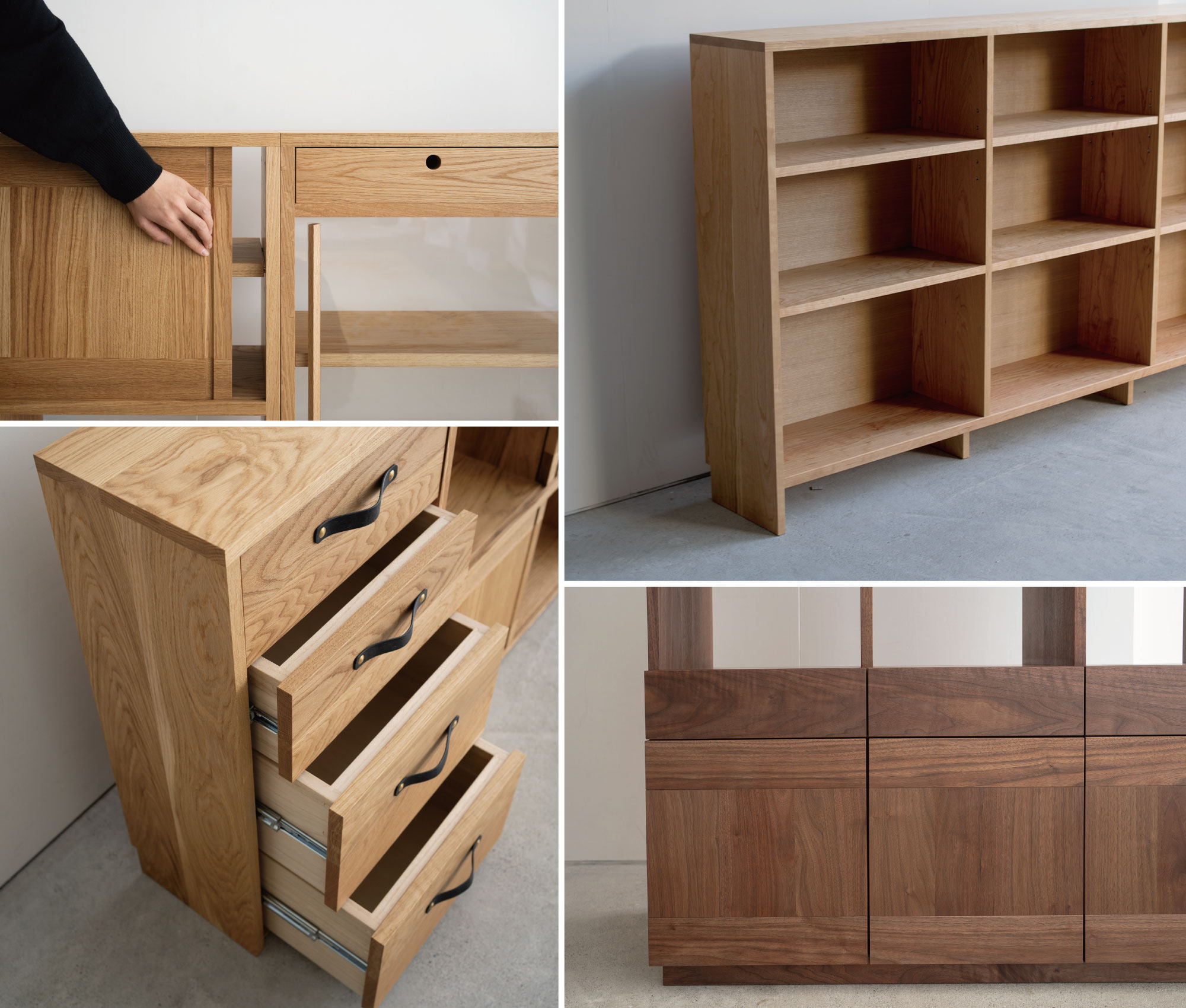 お客さまのご相談を元に扉、棚板、引き出し、取っ手を組み合せながら設計します。